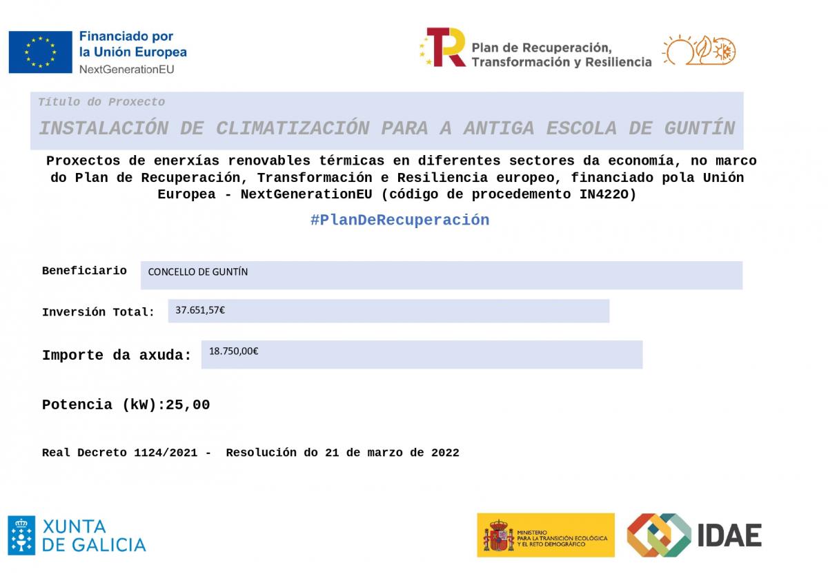 Vista a Resolución de concesión de subvención de data 05/06/2024 ditada pola persoa titular do Instituto Enerxético de Galicia (INEGA) para a actuación denominada INSTALACIÓN DE CLIMATIZACIÓN PARA A ANTIGA ESCOLA DE GUNTÍN (Procedemento: Proxectos de enerxías renovables térmicas en diferentes sectores da economía) ao abeiro da Resolución do 05 de xuño de 2023 da Axencia Instituto Enerxético de Galicia pola que se aproba a convocatoria para o ano 2023 do procedemento de concesión de axudas correspondentes ao Programa de incentivos para a implantación de instalación de enerxías renovables térmicas en edificios non residenciais, establecementos e infraestruturas do sector público, no marco do Plan de recuperación, transformación e resilencia, financiado pola Unión Europea-NextGenerationEU (DOG nº.: 114 de 16/06/2023), concesión coas seguintes condicións: